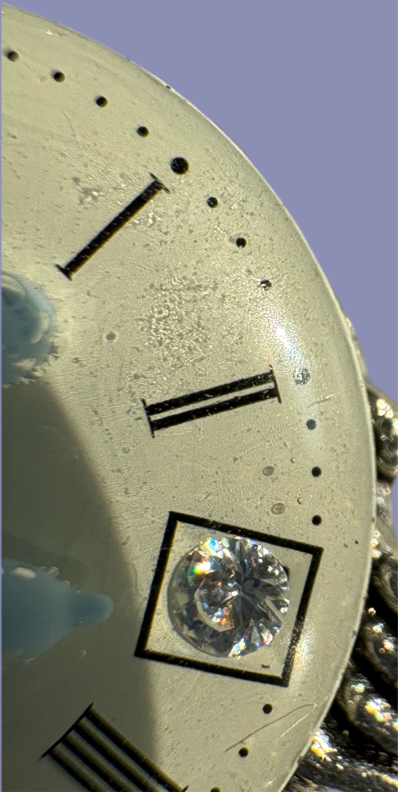 • Quadrante di orologio vintage recuperato , con numeri romani e dettagli argentati, simbolo del tempo che scorre.