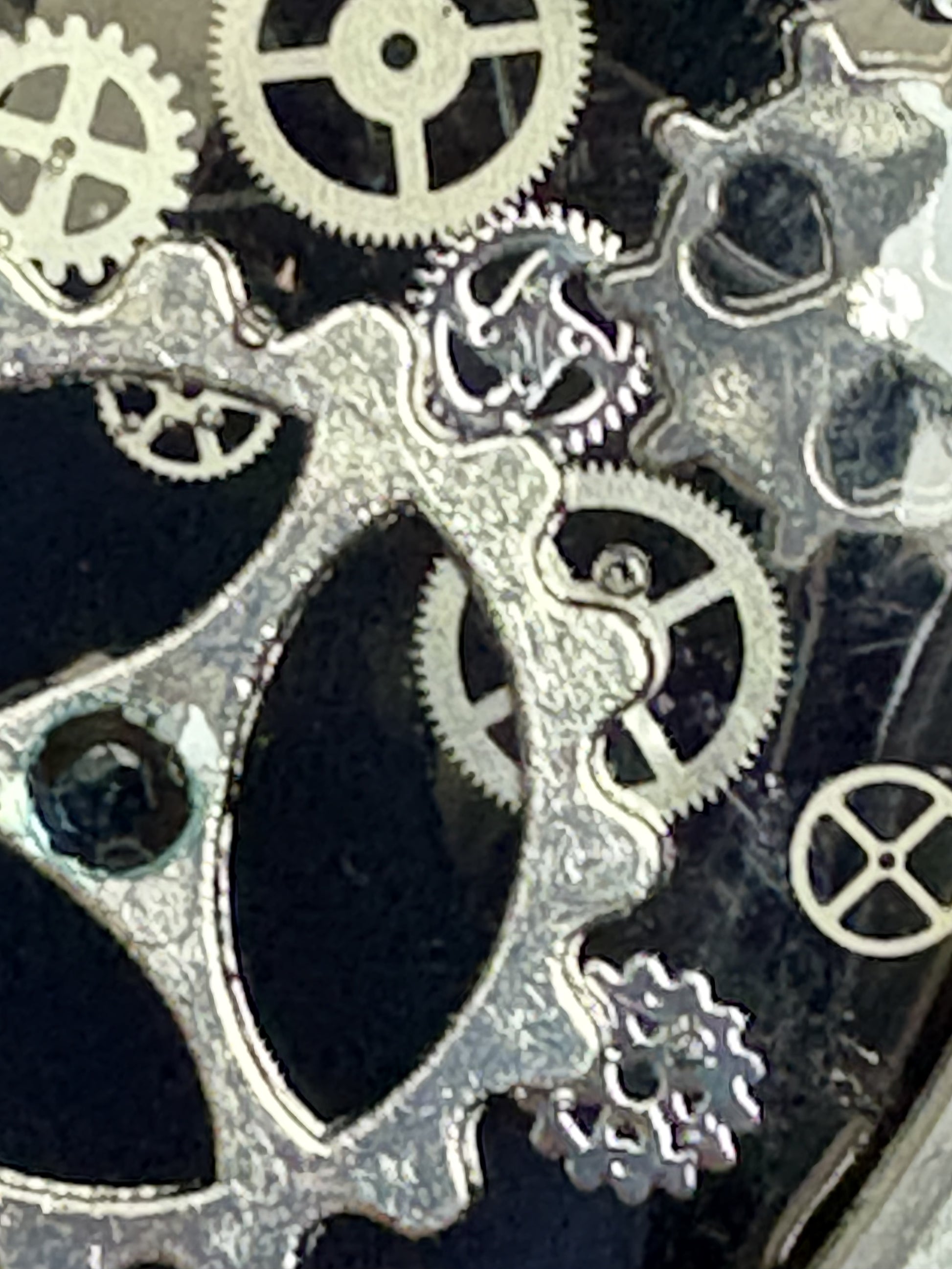 - Ingranaggi color argento , incastonati in una resina trasparente che dona profondità e lucentezza.