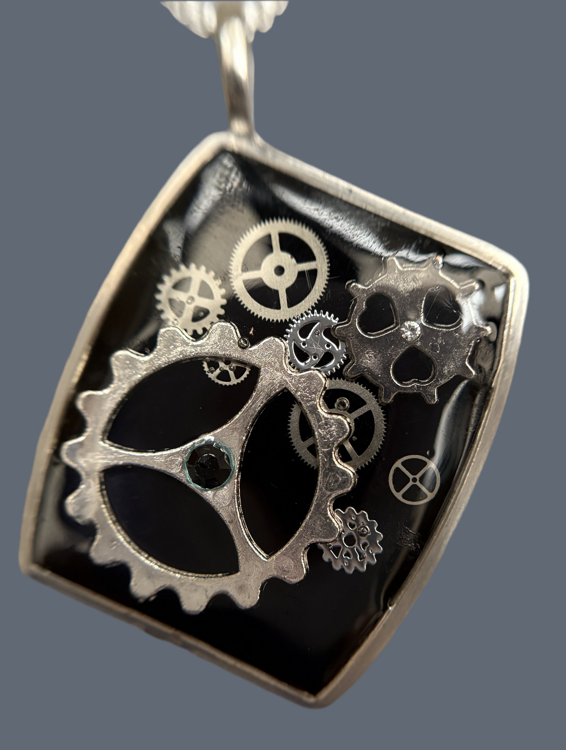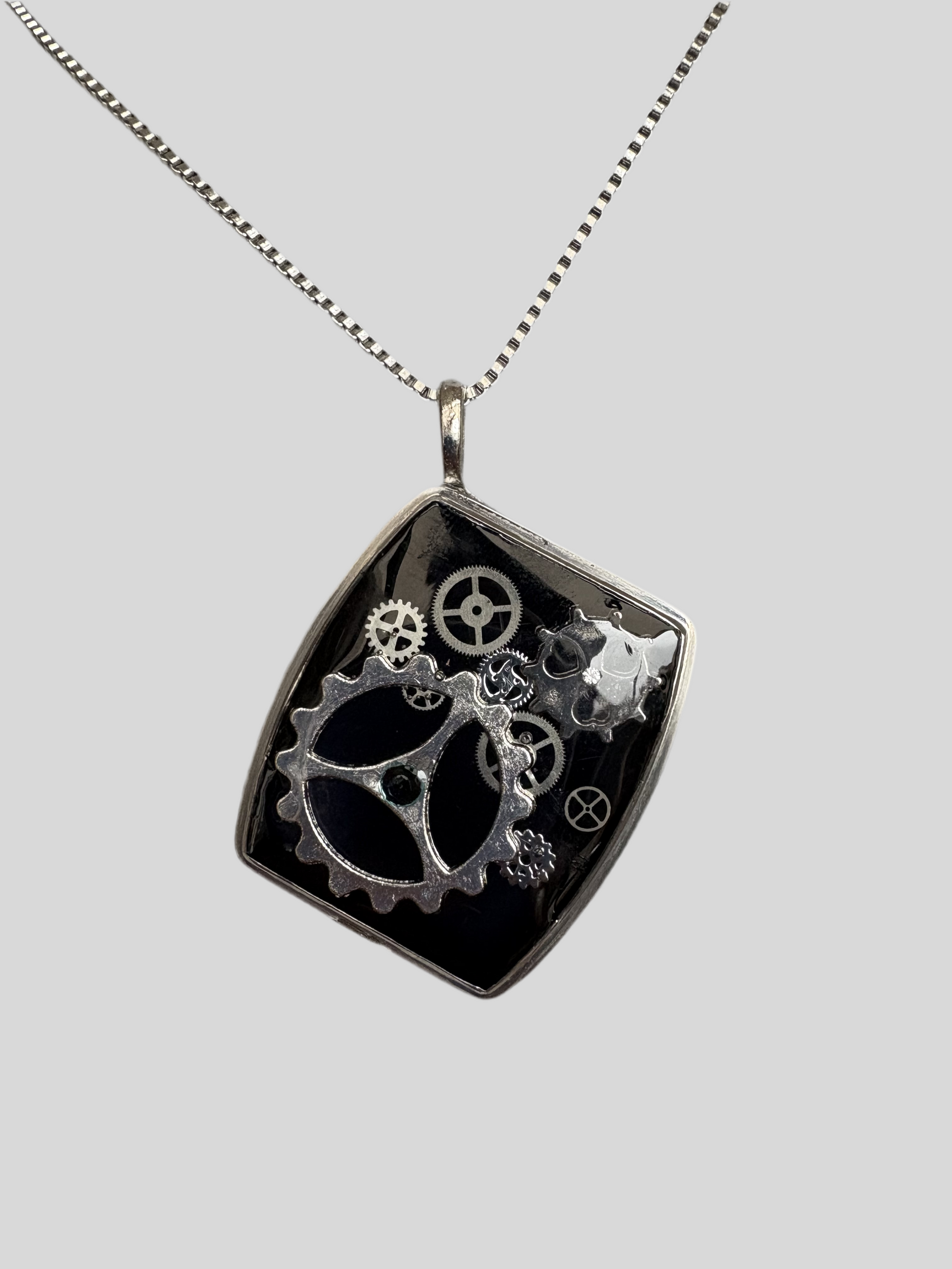 Un gioiello dal design audace e sofisticato, che unisce il fascino dell'ingegneria orologiera a un'estetica moderna e ricercata. Il ciondolo, dalla forma trapezoidale leggermente arcuata, presenta un elegante sfondo nero lucido che esalta la complessità degli ingranaggi argentati, creando un contrasto magnetico e raffinato.