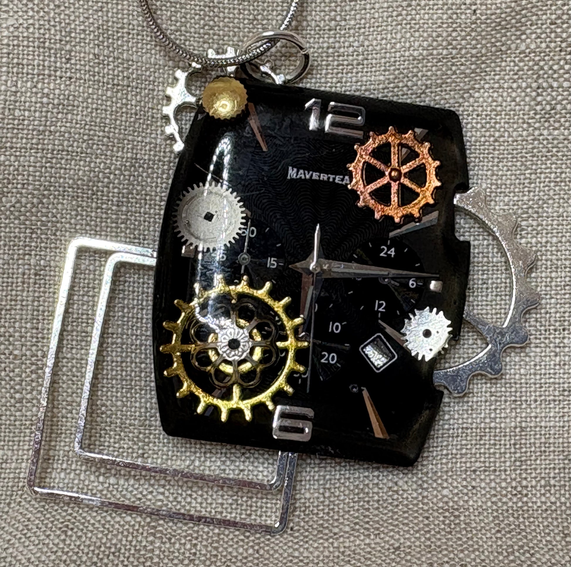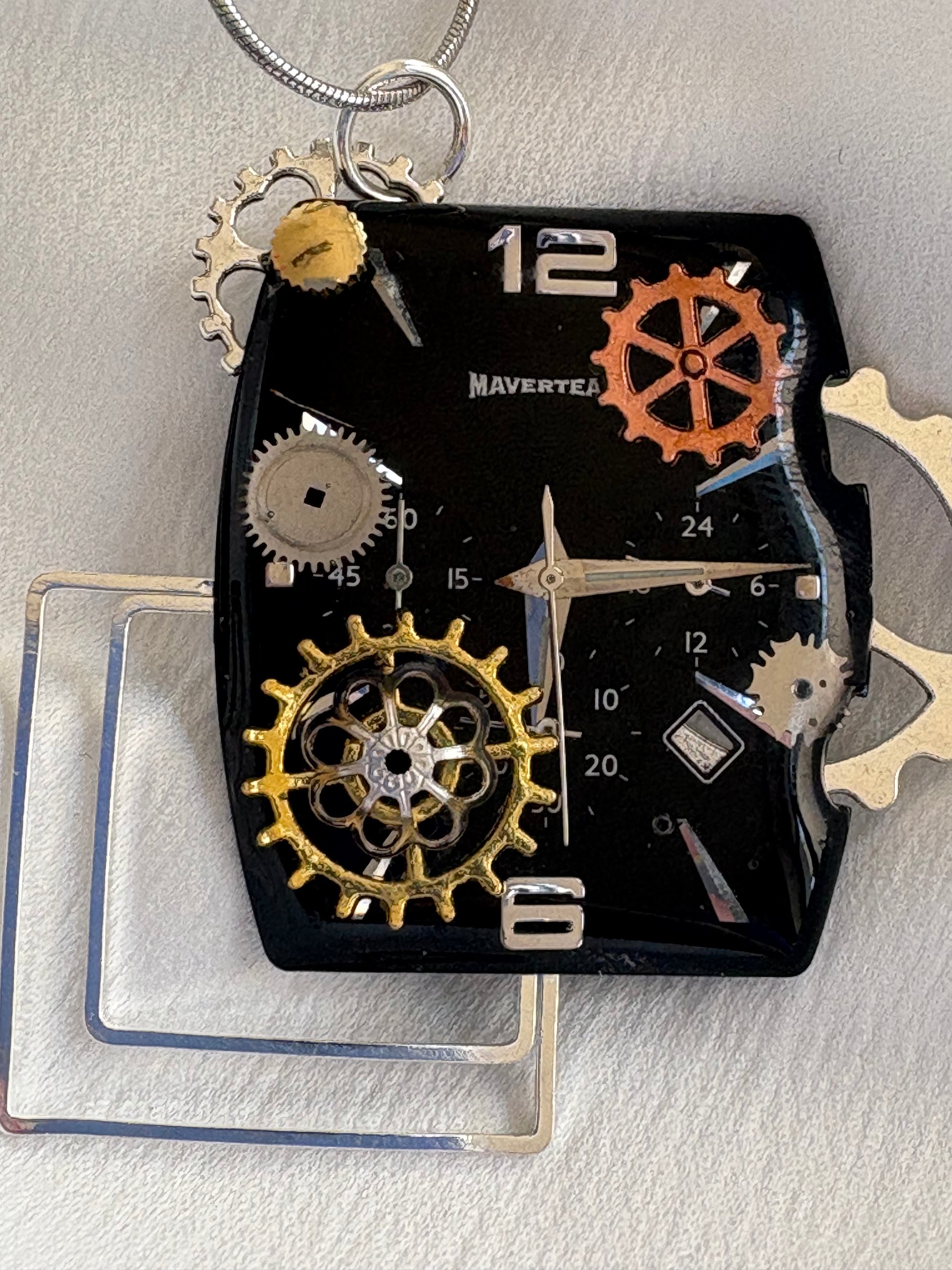 Un pezzo unico che fonde eleganza retrò e spirito steampunk: questo ciondolo nasce dal quadrante di un autentico orologio vintage Maverteam, impreziosito da un intreccio di ingranaggi metallici in oro, rame e argento.