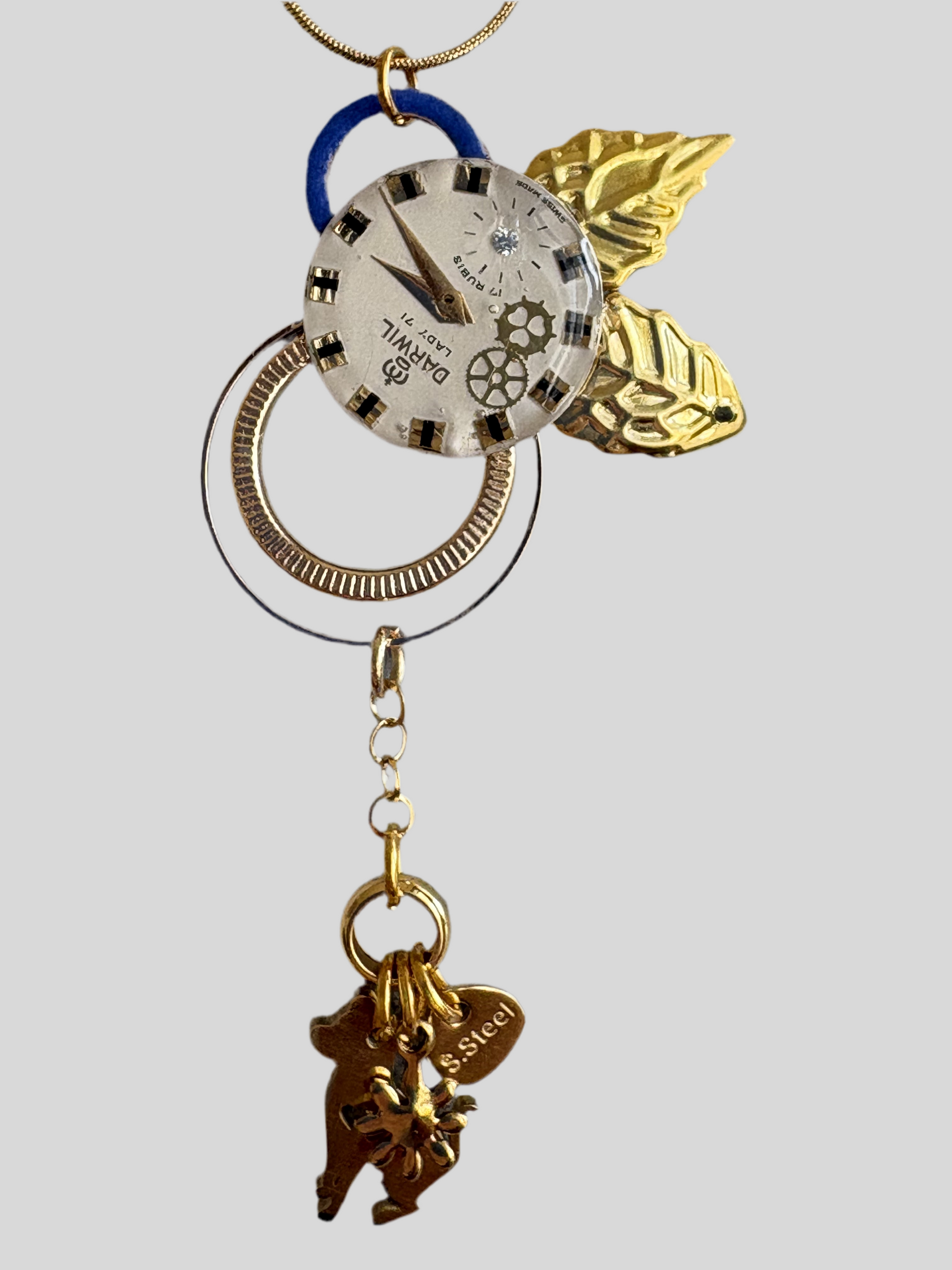 Questo ciondolo raffinato è un'opera d'arte che unisce l'eleganza vintage degli orologi con dettagli simbolici e naturali.
