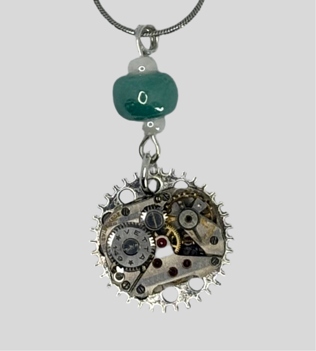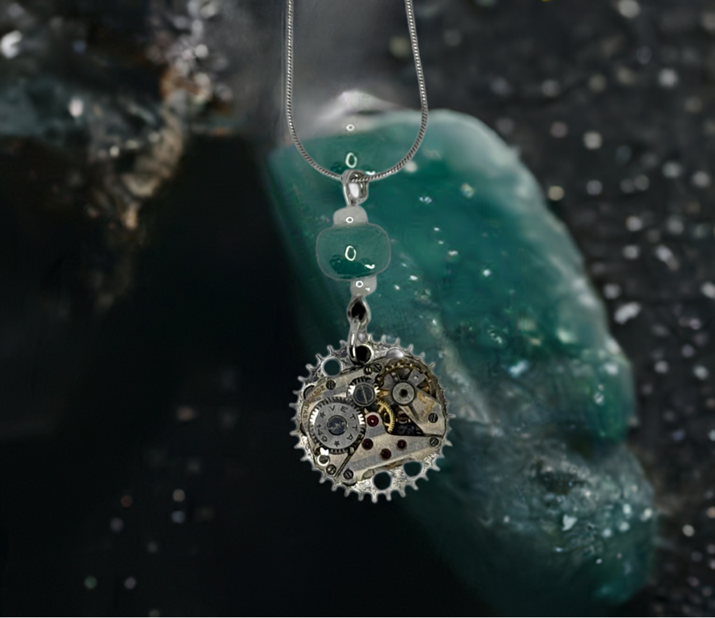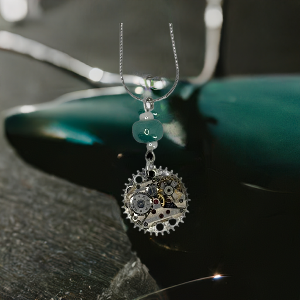 Un gioiello che fonde passato e presente, trasformando antichi meccanismi in un accessorio di grande fascino. Questo ciondolo è realizzato con un autentico movimento d'orologio d'epoca, incorniciato da una ruota dentata argentata, simbolo del tempo che scorre con precisione.