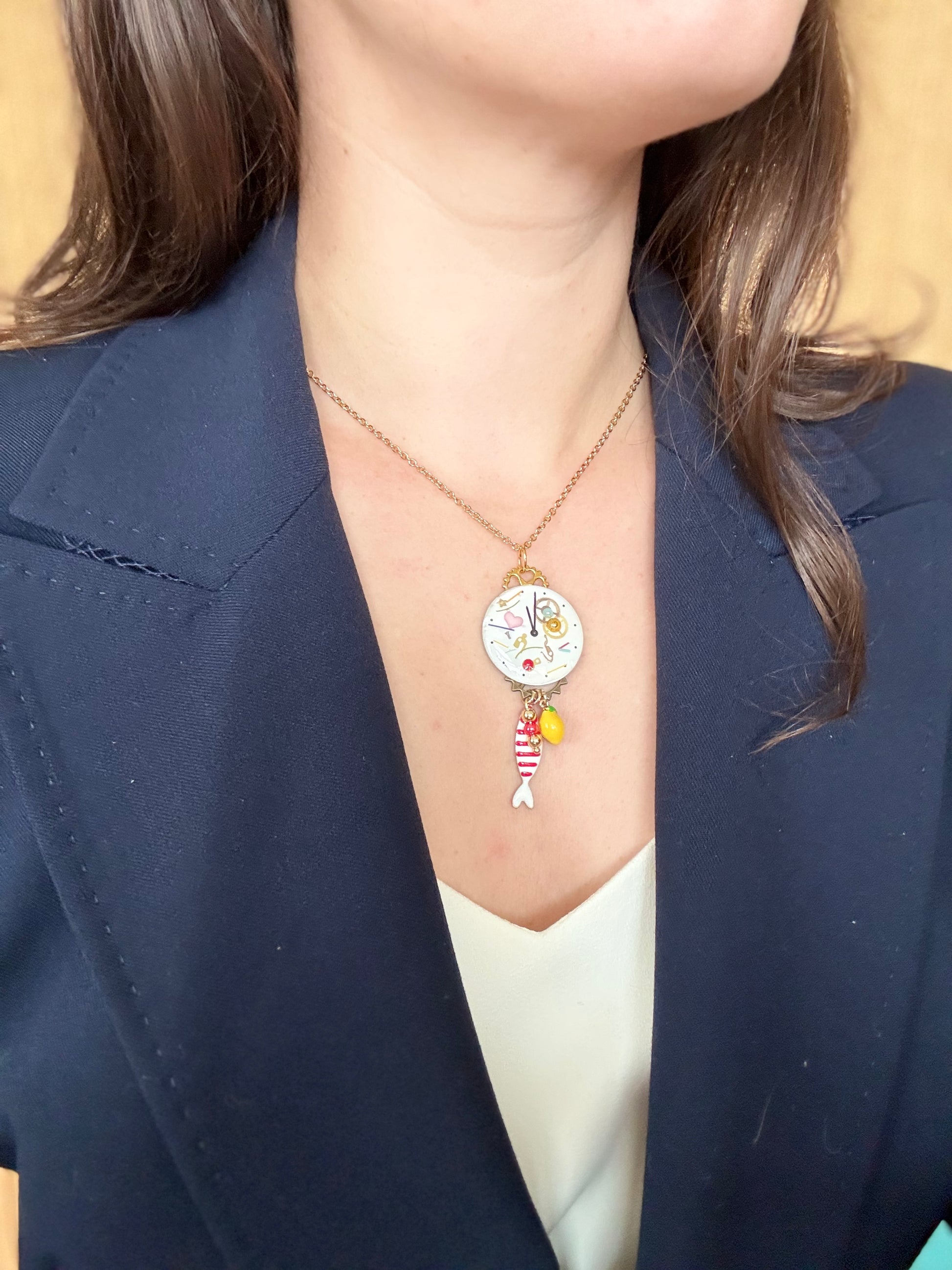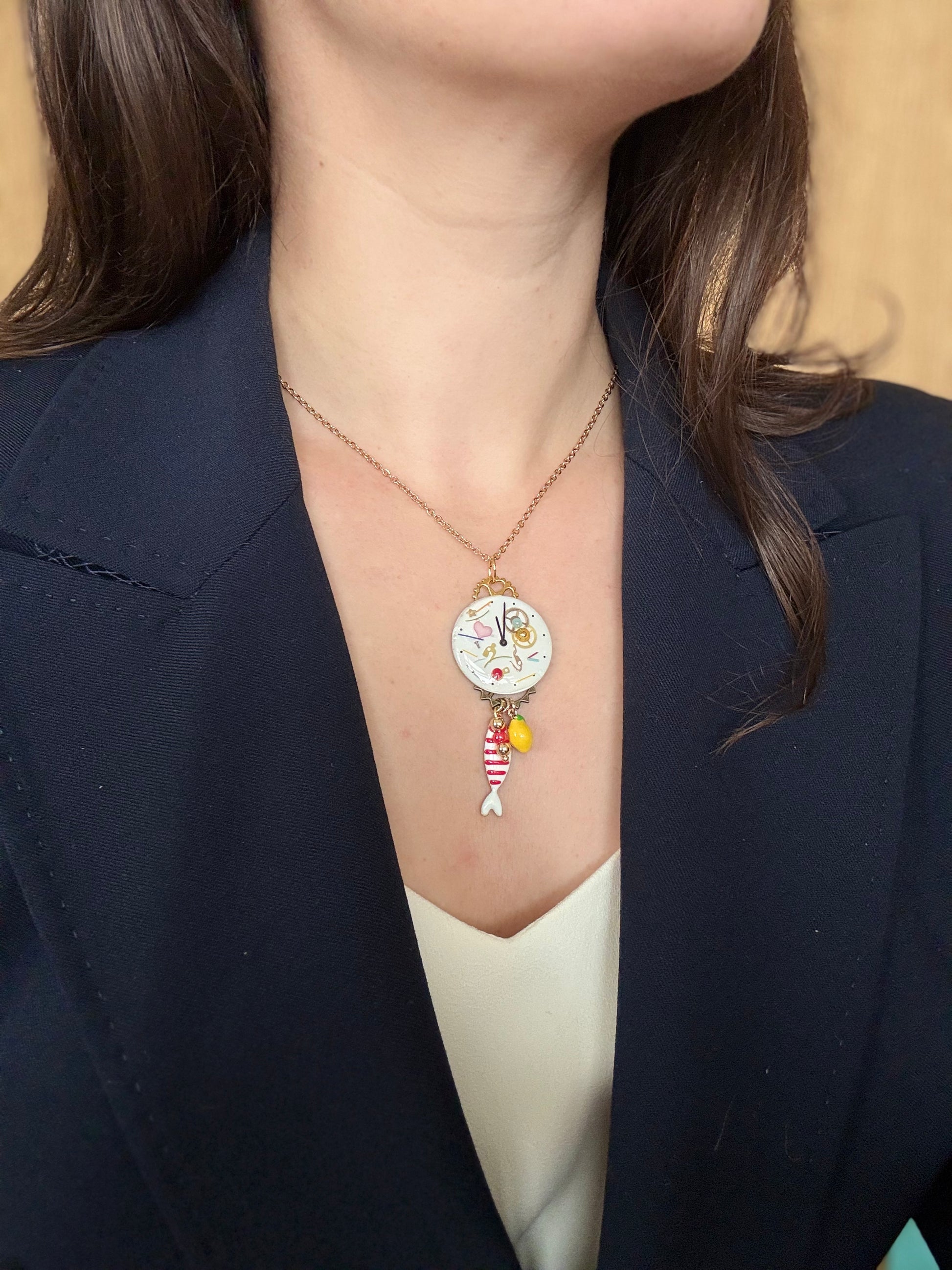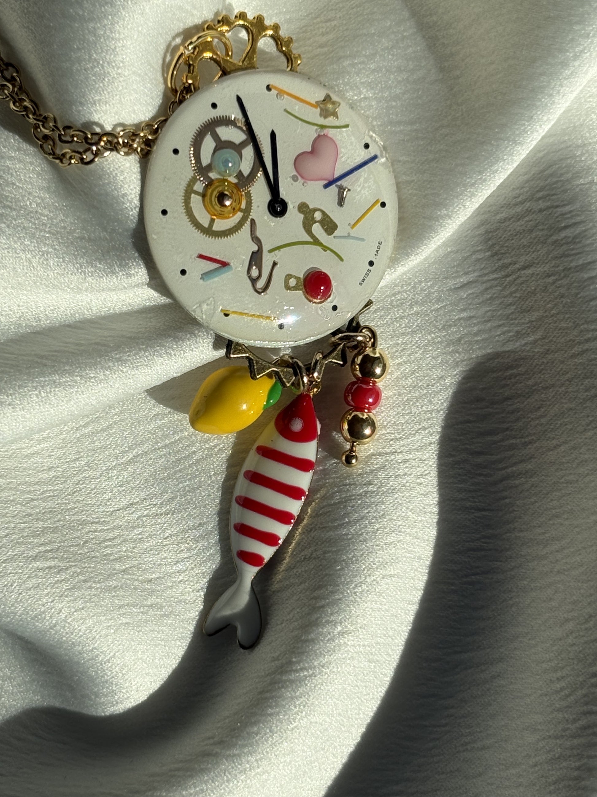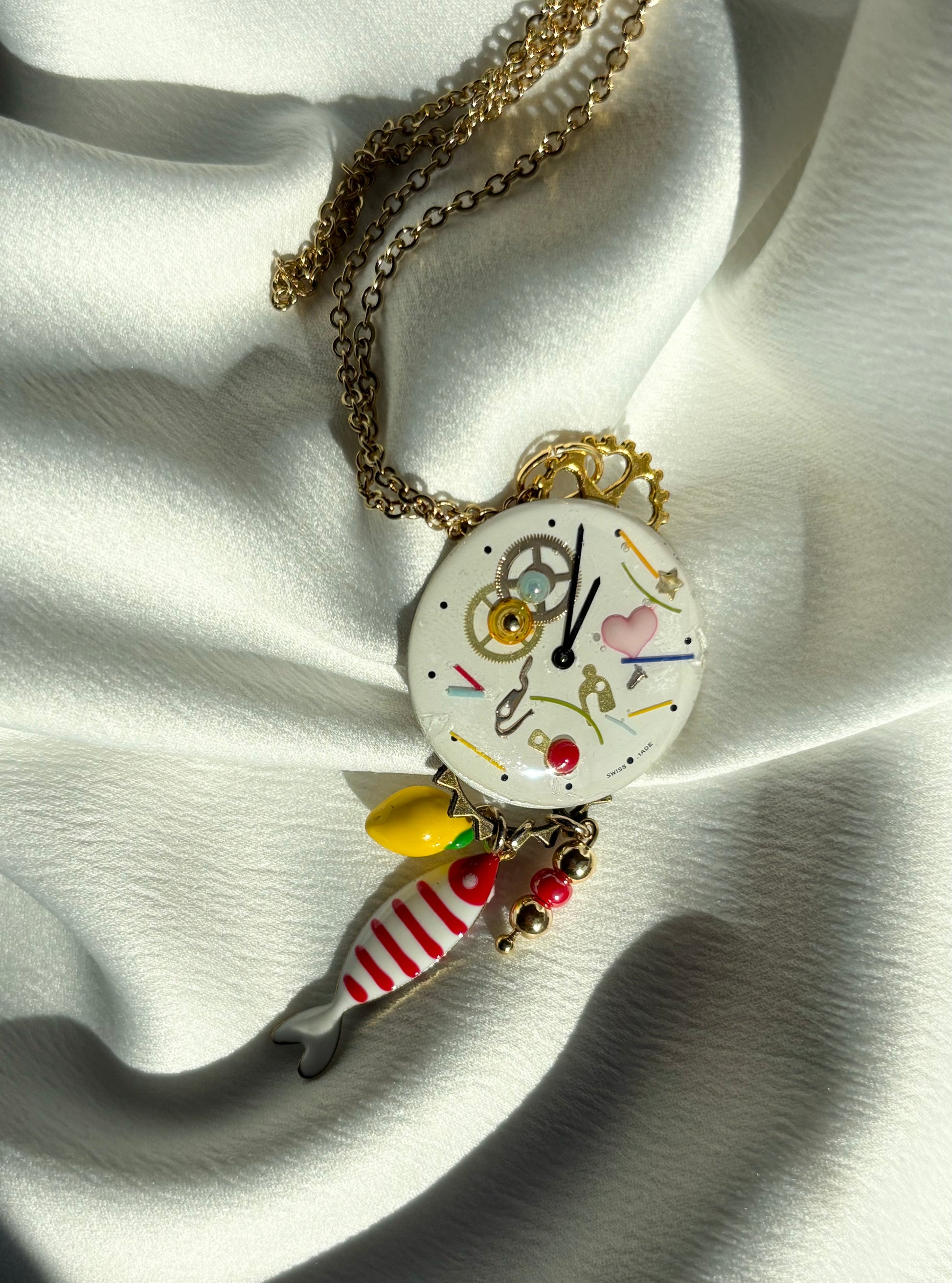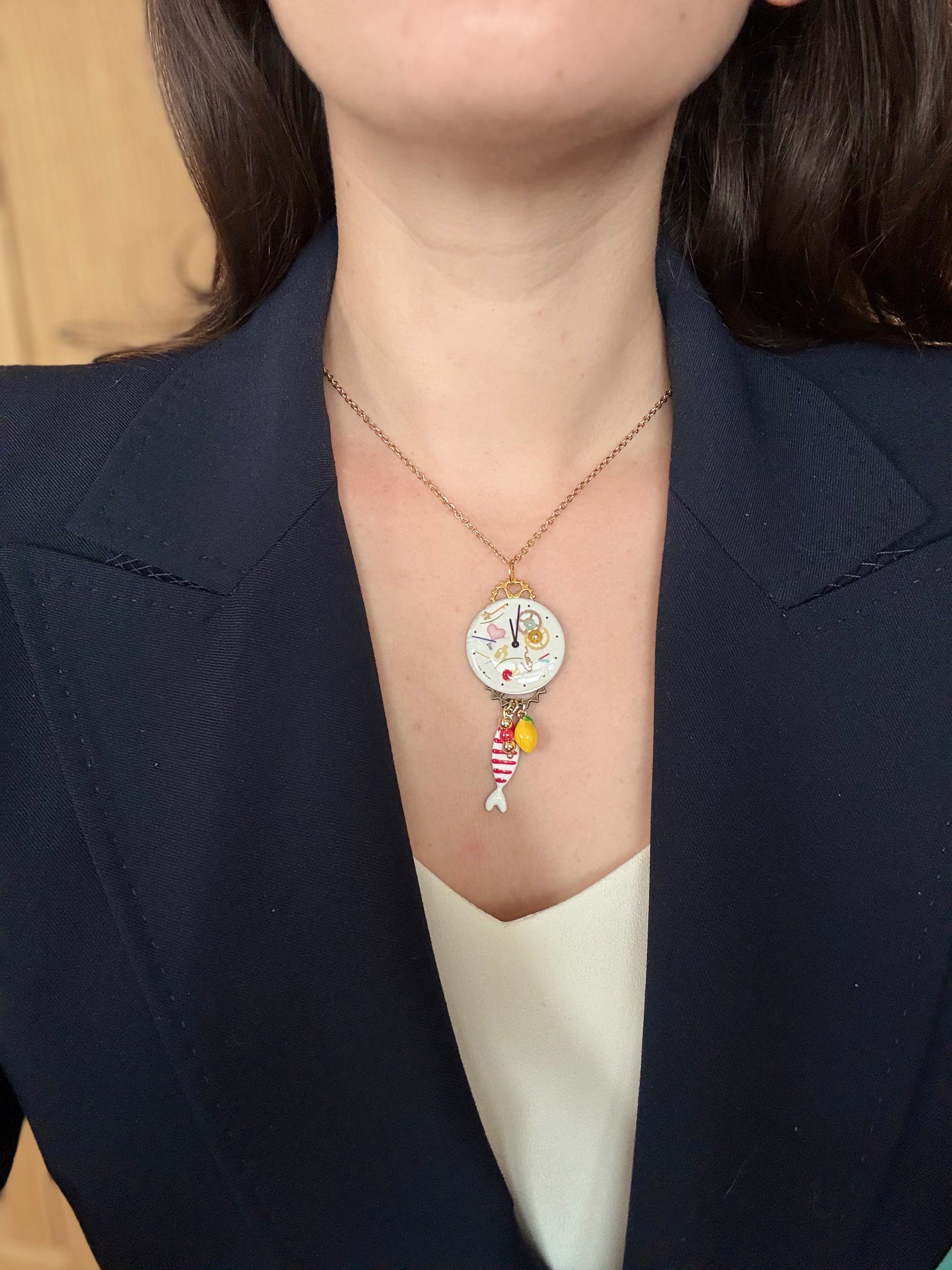 Un gioiello originale e vivace, questo ciondolo nasce dal recupero di un quadrante di orologio vintage, trasformato in un pezzo unico grazie all'aggiunta di dettagli colorati.